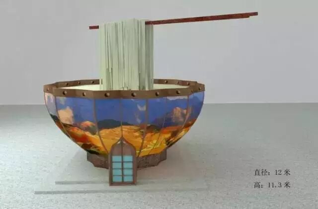 这个大碗面条,直径12米,高11.3米,总体造型为大碗中被筷子挑起的面条!