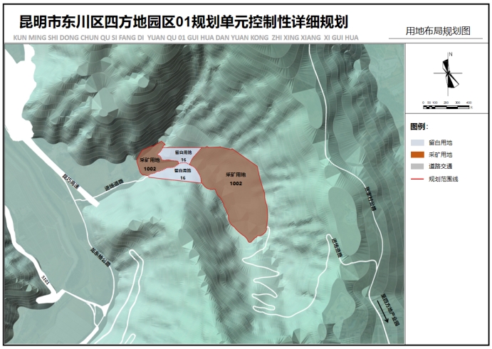 一、规划范围:《昆明市东川区四方地园区01规划单元控制性详细规划》位于云南省昆明市东川区碧谷街道河里湾村东侧,依据《东川区国土空间总体规划(2021—2035 年)》用地布局作为规划地块用途依据,规划范围为城镇单元(四方地园区01规划单元)的单元详细规划,单元范围处于小江东岸河里湾山谷区,东、南、北三侧均为山体环抱。西侧向小江敞口,北侧大尖山~放牛坪山顶(山脊)一带地势最高,大尖山高程1743.2m,与谷底高差近530m,地形坡度25-35°;南侧大脑包山脊近南东、西北向延展,大脑包山顶高程1687.6m,与谷底高差近410m,平均地形坡度30°;北侧山脊近东北南西向延展,大尖山一带地势最高,平均地形坡度36°,活动性冲沟密集发育;西侧为小江河滩。规划单元面积为31.7939公顷(476.91亩)。 二、规划内容:本次规划依据东川区国土空间总体规划,明确土地使用及用地管控,确定四方地园区01规划单元共划分为四个地块,其中HLW01-01-01和HLW01-01-04地块用地性质为采矿用地,用途为工业弃渣场堆渣使用,用于渣场建设用地保障,规定开发强度建筑高度不应超过12米,管理用房等建筑用地面积不超过总用地面积的7%,并对生态环保、安全等提出管控要求,渣场的建设和运营应满足相关技术标准和安全要求,并对风貌塑造、综合交通、市政公用设施等内容进行引导性控制;HLW01-01-02和HLW01-01-03地块用地性质为留白用地,现状为复垦区和陡坡,无利用意愿及利用条件,后续将论证后调出城镇开发边界。 三、规划定位:通过对上位规划的衔接、周边功能的协调、用地的实际需求等进行分析。地块功能定位为服务于东川区四方地工业园区的工业弃渣集中处置。 |